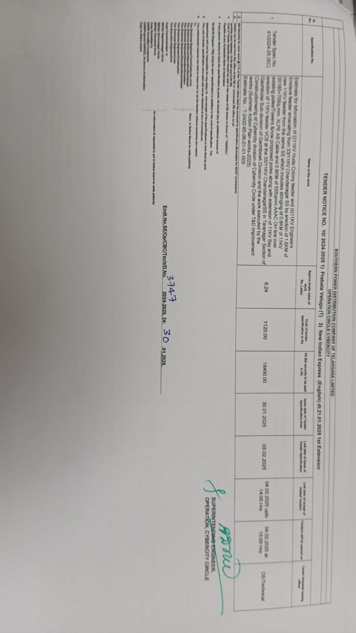 TENDER NOTICE NO.05/2025-26 Extension-2 Tender Specification:29 31 32/25-26 Tender Specification: 43 to 49/25-26 SUPERINTENDING ENGINEER, OPERATION, MEDCHAL CIRCLE |