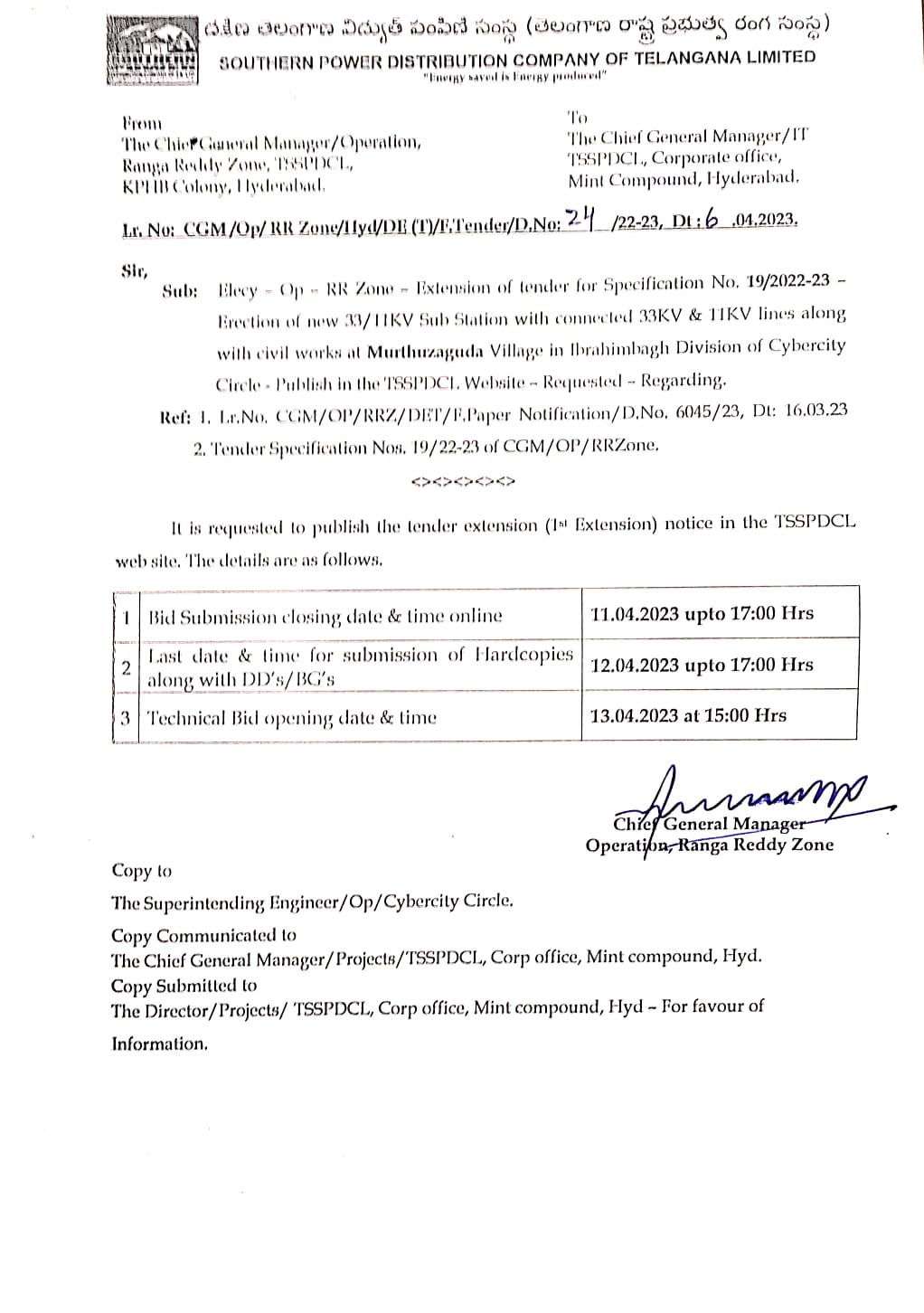 1st EXTENSION OF TENDER NOTICE NO.19/2022-23 Chief General Manager Operation, Ranga Reddy Zone
