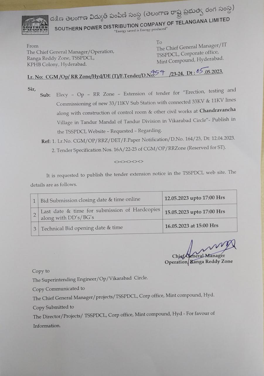 Tender Specification No.CGM/OP/RR Zone-20 21/2022-23 Chief General Manager Ranga Reddy Zone, TSSPDCL, KPHB Colony, Hyderabad. |
