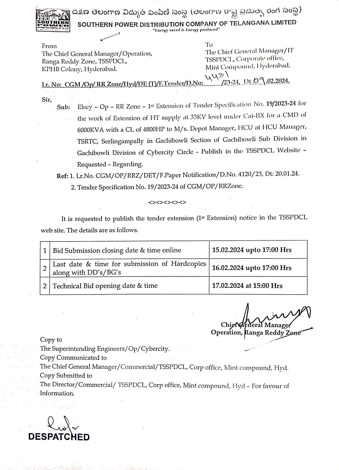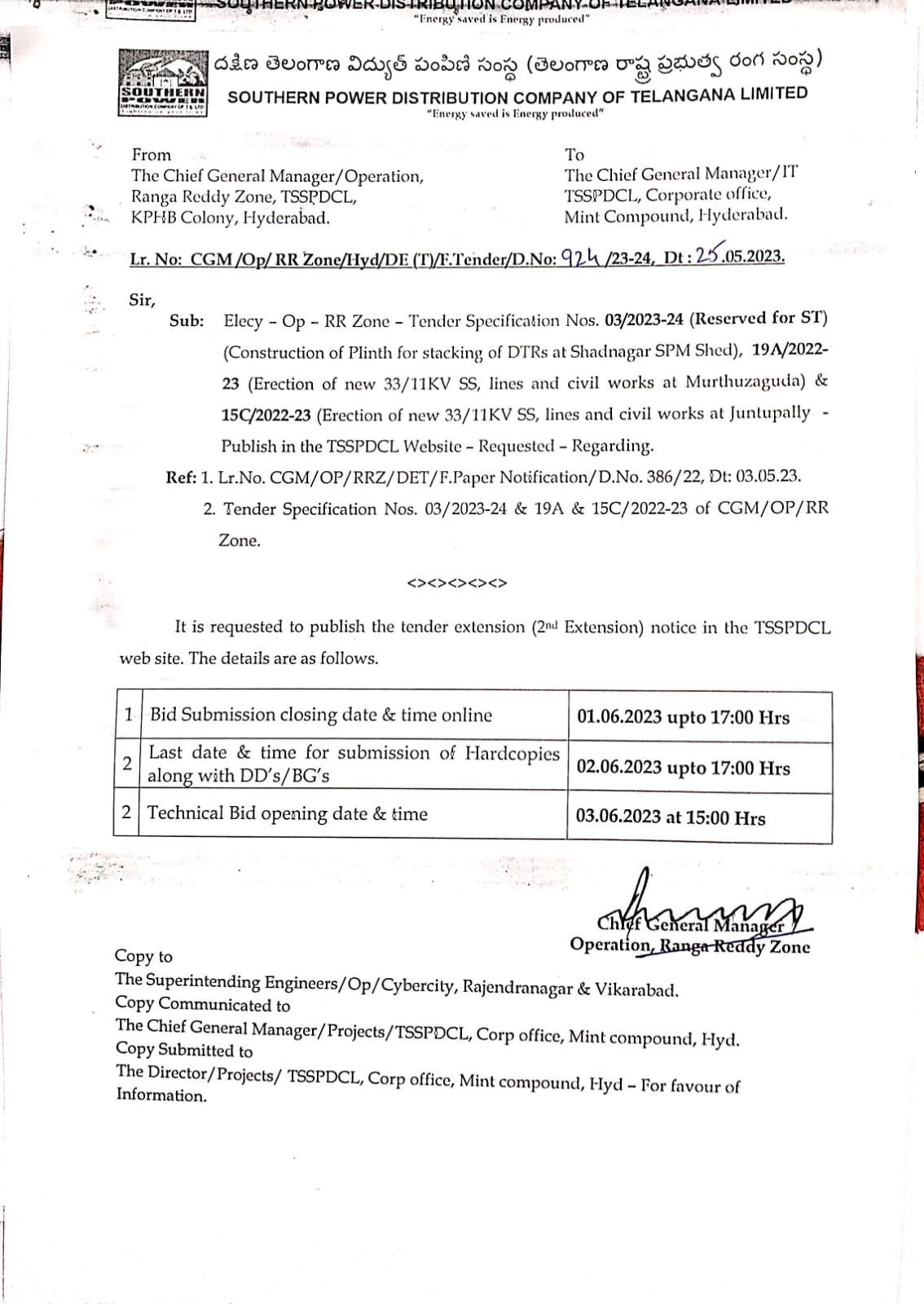 E-Procurement Tender Notice.01/2023-24. Tender Specification No:01 02/2023-24 1st extension extension of specification No.17/2022-23 Chief General Manager Operation, Rural Zone,TSSPDCL,Gagan Vihar, Nampally, Hyd.