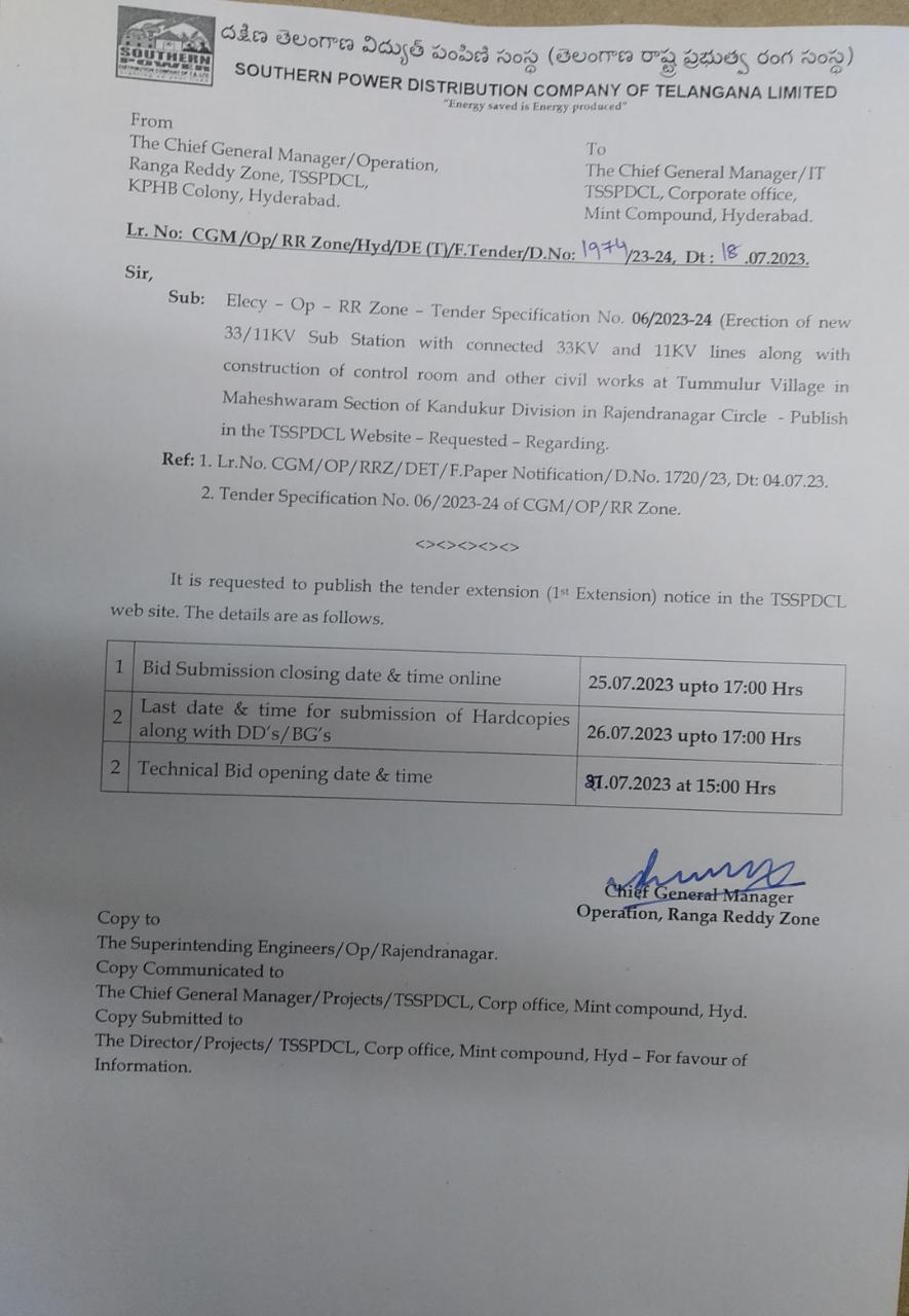 Tender Notice for Tender Specification No:T-23/25-26 (Converted to Open), Extended Tender Specification No:T-31/25-26 Tender Specification No: T-33 35/25-26(New) Superintending Engineer, Operation.Siddipet Circle, TGSPDCL. |