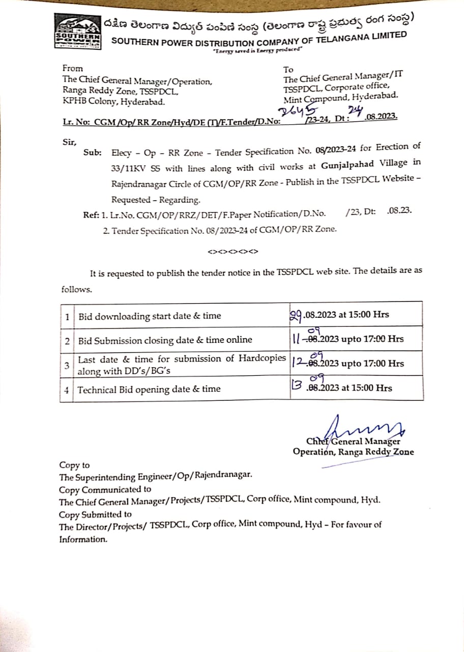 BID No.Chief General Manager/Master Plan /GH/TSSPDCL:01/2023-24. Chief General ManagerMaster Plan Zone, Mint Compound,Hyderabad |